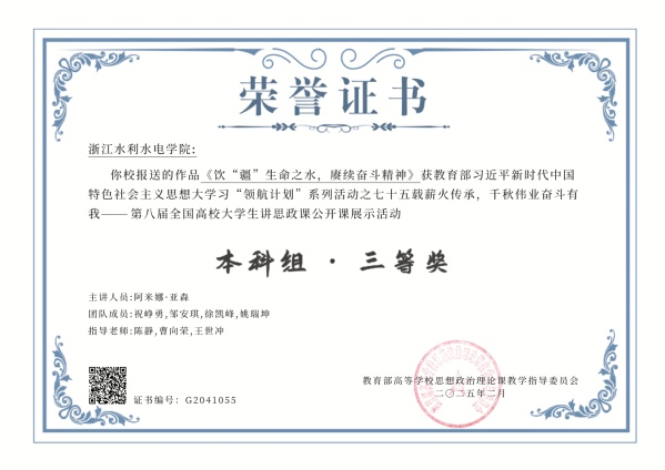 近日,教育部公布了“七十五载薪火传承,千秋伟业奋斗有我——第八届全国高校大学生讲思政课公开课展示活动”获奖作品名单,由365完美宣传部、马克思主义学院、校团委和建筑工程学院团委联合指导的作品《饮“疆”生命之水,赓续奋斗精神》荣获全国三等奖。