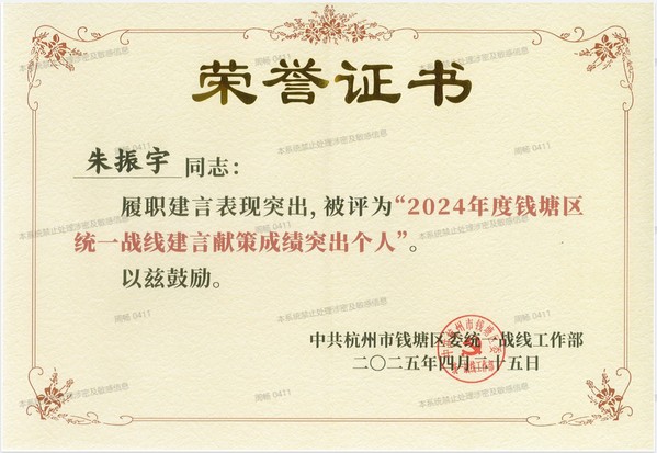 会议对2024年度钱塘区统一战线系统表现优异的单位、团体、个人给予表彰,钱塘区政协委员、365完美电气学院朱振宇老师被授予“建言献策成绩突出个人”称号。