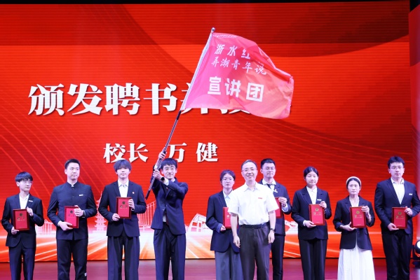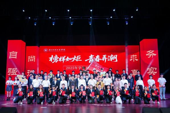 5月14日下午,学校2025年学生表彰大会暨浙江省“我是国奖生·青春榜样说”报告会在南浔校区大剧院举行。大会分自强、务实、尚德、求真四个篇章,共表彰了100余名先进个人和先进集体代表。校党委书记钱天国致辞。校长万健为“浙水红潮·弄潮青年说”宣讲团成员颁发聘书并授旗。全体校领导,有关职能部门、各二级学院党政主要负责人、学生工作负责人和师生代表参加。