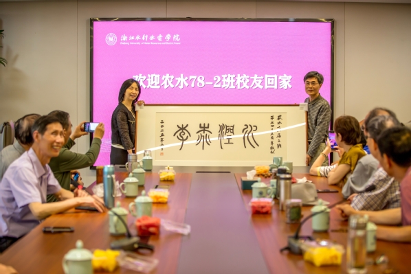 活动中,吴婉玲介绍了学校近年来的发展及水利学院学科建设、人才培养等情况,感谢校友们对学院教学实践等各项工作的支持,期望校友们能常回家看看。楼玉宇回忆了求学之路和在校工作经历。农水78-2班同学施阿新回顾了校园的青春岁月、师生情怀。农水78-2班向学校赠送书法作品“水润桃李”,表达对母校培养的感恩感谢之情。