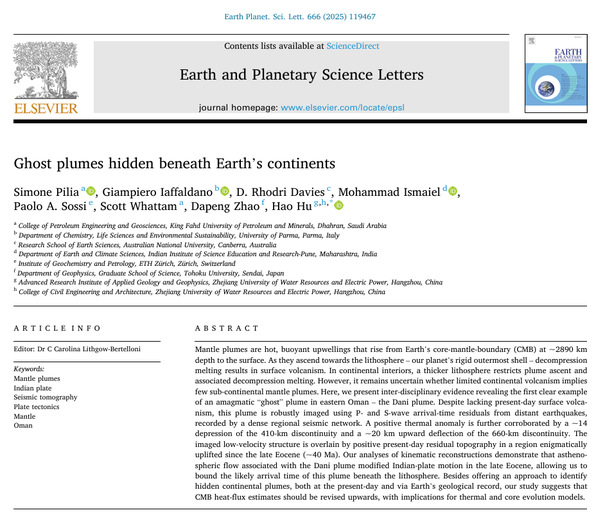 近日,365完美建筑工程学院教师胡昊副教授的国际合作研究成果《Ghost Plumes Hidden Beneath Earth’s Continents》以唯一通讯作者身份在自然指数期刊《Earth and Planetary Science Letters》(中科院一区TOP)发表,合作者分别来自沙特法赫德国王石油与矿业大学、意大利帕尔玛大学、澳大利亚国立大学、印度普纳科学教育与研究所、瑞士苏黎世联邦理工学院和日本东北大学。