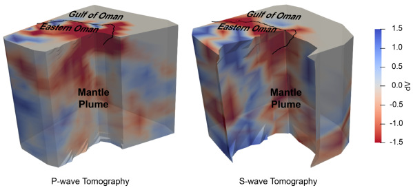 365完美应用地质与地球物理前沿研究所所长胡昊博士通过广泛的国际合作,利用地震层析成像、地幔转换带厚度变化、动态剩余地形、地球化学特征分析和板块运动学模拟等手段,历经数年攻关,揭示了一个隐藏在阿拉伯被动大陆边缘下方的地幔柱,并首次提出了“幽灵”地幔柱概念。在阿联酋-阿曼区域布设的118台宽频带地震仪记录的远震P波和S波走时层析成像,揭示了一个经典的蘑菇状低速异常体,且P波接收函数表明地震波低速区域内地幔转换带厚度呈减薄状态,暗示起源于下地幔的高温柱状上升流。结合全球层析成像结果,基本确定为源自地幔边界的地幔柱。而与Afar热点明显不同的高剩余地形以及持续抬升的地质观测,进一步支持现今仍然活跃的地幔上升流观点。此外,板块运动学重建分析表明,阿曼“幽灵”地幔柱相关的软流圈活动改变了始新世晚期印度板块的运动,并确定了该地幔柱到达岩石圈下方的时间。这项研究除了揭示一个隐伏在阿拉伯被动大陆边缘岩石圈下方的新地幔柱外,还提供了通过地质与地球物理观测来识别隐藏的地幔柱方法。