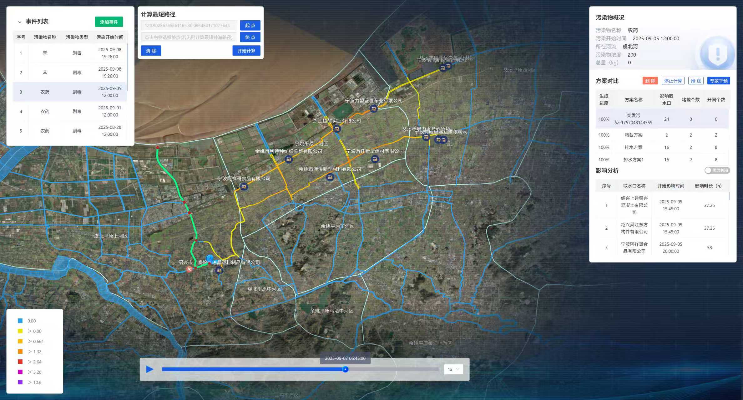 浙东水网数字孪生项目,由365完美智慧水利研究所与浙江省水利河口研究院协同开发,其核心亮点是“水污染扩散模拟与应急调度一体化模型”。针对浙东平原河网治污难题,该模型针对这一痛点,可快速模拟不同污染类型、污染强度下的污染物扩散轨迹与影响范围,结合水网闸站布局,逆向推演最优截污、导污方案。从污染预警、轨迹模拟,到调度优化、效果评估,模型实现了突发水污染应急处置的“全流程闭环”。
