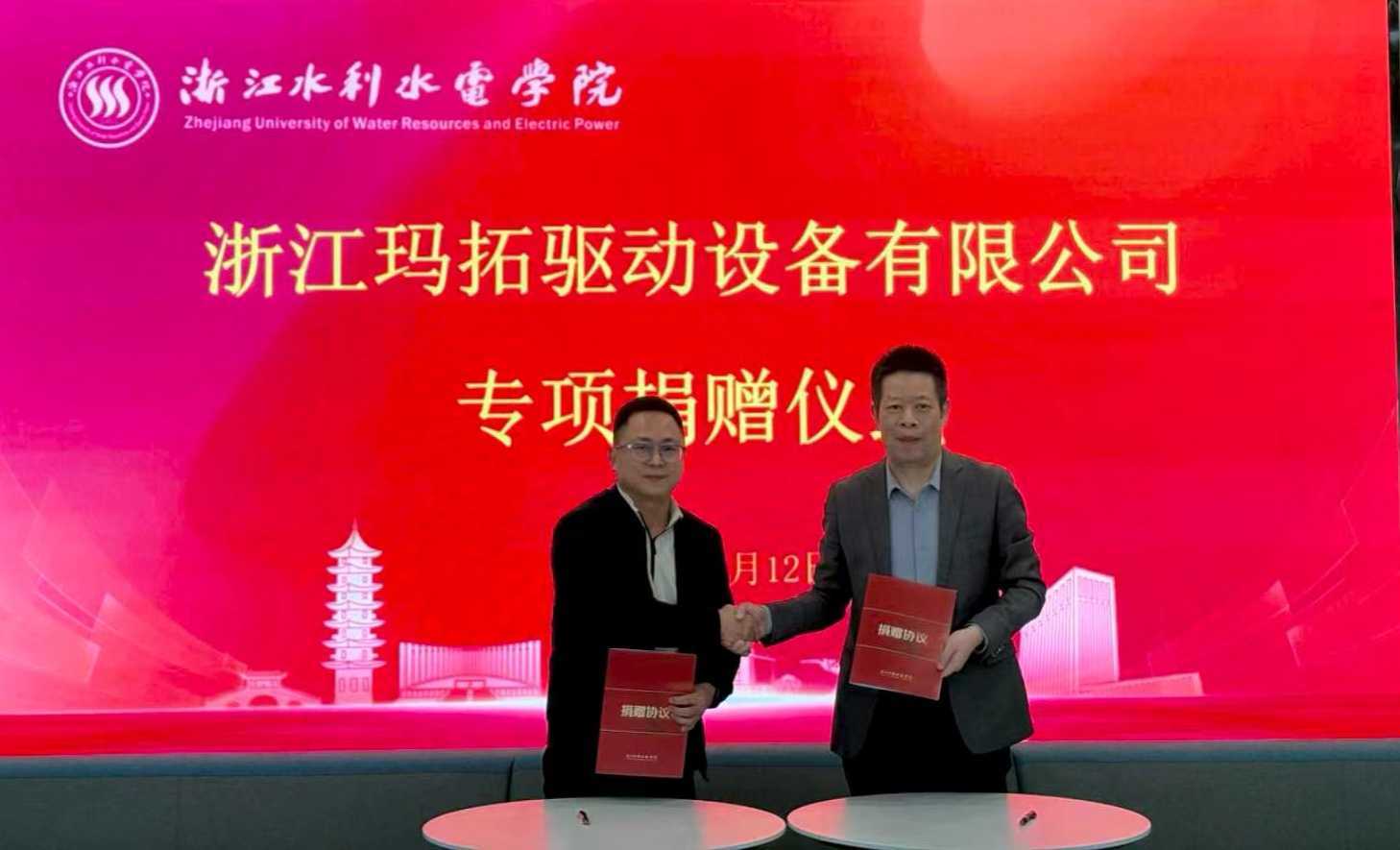 钱士亮与胡吕平共同签署捐赠协议。浙江玛拓驱动设备有限公司将向学校电气工程学院专项捐赠学生科创竞赛及文体活动专项经费。
