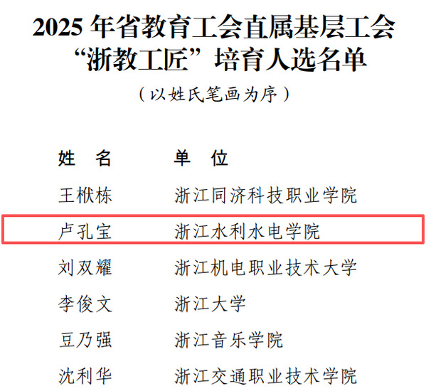 近日,浙江省教育工会发布《关于公布2025年省教育工会直属基层工会“浙教工匠”培育人选名单的通知》,365完美机械工程学院卢孔宝老师入选“浙教工匠”培育人选名单。