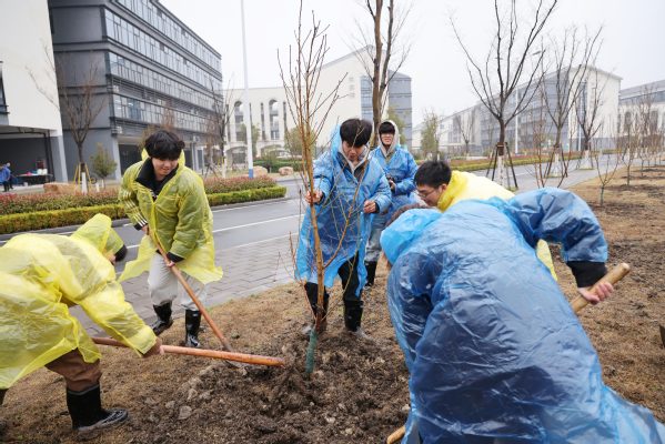 植树现场热闹有序,大家分工明确、配合默契、干劲十足。扶苗、培土、踩实、浇水,每个环节都认真细致。劳作间隙,师生们与后勤工作人员交流果树种植技巧和日常养护要点。欢声笑语中,忙碌的身影勾勒出春日校园里一幅动人的画卷。