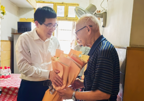 钱天国先后来到黄世钧、滕中健、王仿荀等老领导、老党员家中看望慰问。其间,钱天国与老领导、老党员亲切交谈,代表学校党委为他们送上亲切的问候和党组织的关怀,为“光荣在党50年”老党员颁发纪念章,祝福大家健康快乐。