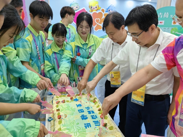 In the volunteer rotation and rest space, the entire area was redecorated with birthday cakes, colorful candies, green lotus bouquets, and gift packages. As the birthday song echoed, Qian, Chen and the “Little Blue Lotuses” volunteers jointly cut the birthday cake, sharing an unusual collective birthday party and witnessing the special love and warmth within the 19th Asian Games venue. Qian and Chen also presented flowers to the leaders of the venue operation team and the teachers leading the volunteers to express gratitude for their diligent efforts.