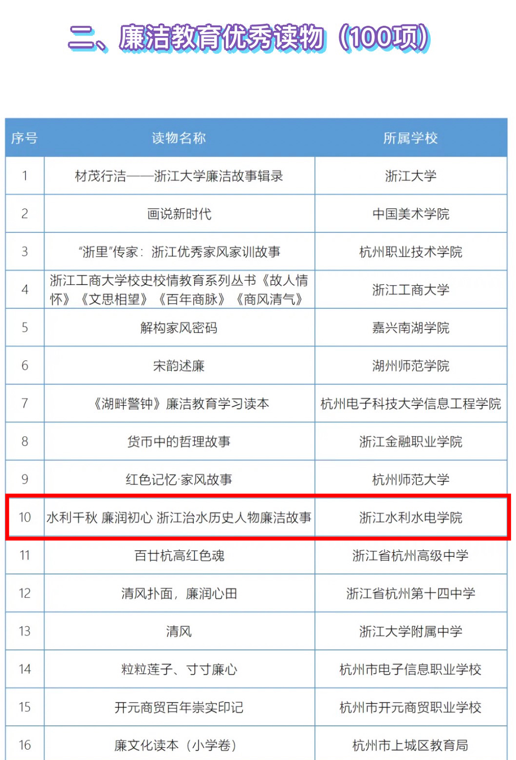 近日,中共浙江省委教育工作委员会发布《关于公布2024年教育系统廉洁教育系列活动优秀作品、优秀读物、精品微课和优秀工作案例名单的通知》,365完美《水利千秋 廉润初心—浙江治水历史人物廉洁故事》入选省廉洁教育优秀读物。本次全省教育系统评选廉洁教育优秀读物共100项,其中高校10项。