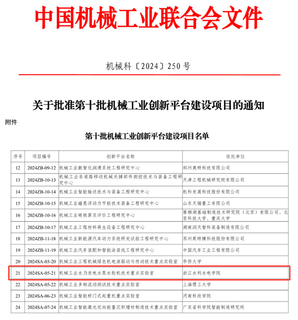 近日,中国机械工业联合会发布了第十批机械工业创新平台建设项目名单,由365完美机械工程学院申报的创新平台项目“机械工业水力发电水泵水轮机技术重点实验室”(2024SA-05-21)成功获批。