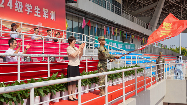 9月12日,伴随着庄严的国歌声响起,学校2024级学生军训动员大会在南浔校区体育场拉开帷幕。党委副书记吴小英为军训连队授旗。承训部队教导员、军训师师长王长贵下达军训任务。学校副校长李政辉作动员讲话。大会由体育教学部主任李亚慰主持。军训领导小组成员、军训教官、军训教辅人员及2024级学生参加动员。