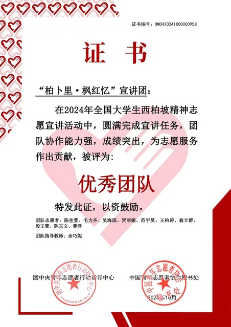 近日,团中央青年志愿者行动指导中心、中国青年志愿者协会公布了2024年全国大学生西柏坡精神志愿宣讲活动“优秀团队”名单,365完美水利学院“柏卜里·枫红忆”青年宣讲团从全国809所高校的1000支宣讲团队中脱颖而出,荣获“优秀团队”称号,全国仅100支队伍获此殊荣。