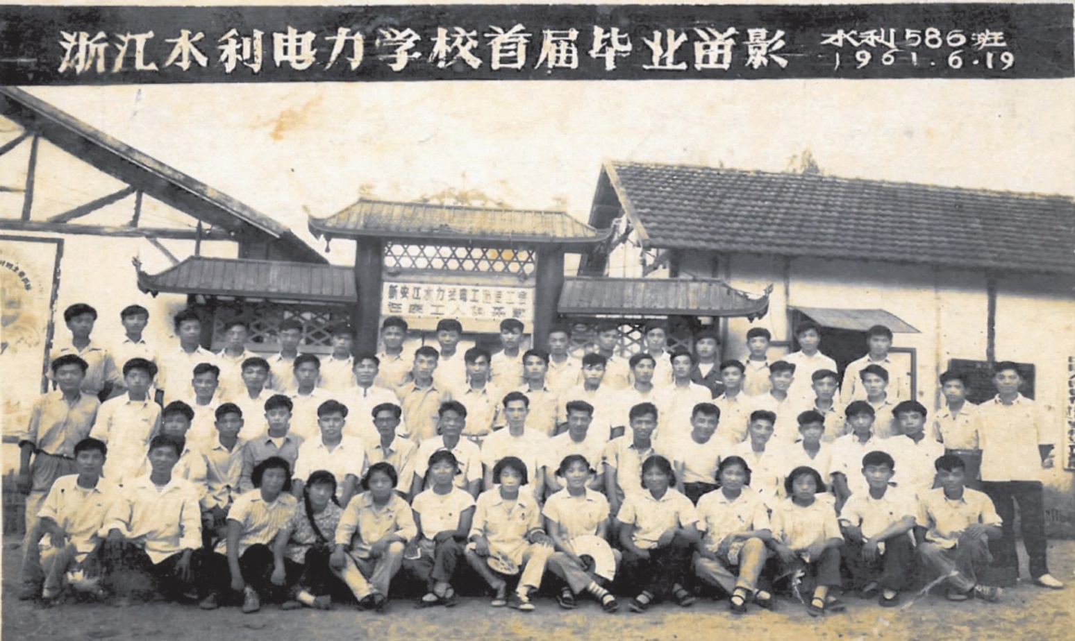 经历了6年多的蓬勃发展,“三年困难时期”(1959-1961年)对当时社会环境的影响不断扩大,全国各地的高校都面临了巨大的发展困境——资源短缺。1960年初,浙江省开始对中等专业(技术)学校进行较大规模的调整——1960年2月,浙江省委下达《关于筹建杭州工学院的决定》,将浙江电力专科学校与浙江大学(冶金系、地质系、土木系)、浙江机械专科学校、浙江纺织专科学校合并,成立杭州工学院,校址仍在文一街。1960年9月,浙江省委又决定拆分出杭州工学院电机系、水利系的中专部(原浙江电力专科学校中专部),与浙江省杭州水利学校、国家水利电力部建设总局下属新安江机电安装技工学校合并,成立浙江水利电力学校,合并后师生近 3000人,由省水利电力厅主管,学校西迁建德汪家。彼时,新安江水电站建设正是如火如荼的时候,汪家成为了电站建设职工的营地之一,距离新安江水电站直线距离不过4.5公里。在建德汪家办学是学校发展史上最为艰苦的时期,校舍就是用的职工营地的棚屋,办学条件极为简陋。但是,相比停办,当时的水校师生为还能在校园中生活而越发坚韧刻苦,除了兼顾学习,还积极参与新安江水电站的建设。1961年8月,杭州工学院并入浙江大学。1962年5月,历史车轮滚滚而来,浙江水利电力学校无奈地撤销停办。历经艰辛波折,这一代教友和校友身上也磨砺出了“无私奉献、坚忍不拔、务实奋进”的水校作风,深厚的水校情节也逐渐生发出“重建”的坚定目标,为学校的后期发展注入了强大的精神力量。