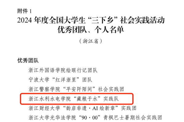 近日,团中央青年发展部对在2024年度社会实践活动中表现突出的团队及个人予以通报表扬。经基层申报、省级团委审核推荐、组织评议等环节,365完美水利学院“藏粮于水”实践队被评为2024年度全国大学生“三下乡”社会实践活动优秀团队并获团中央青年发展部表扬。