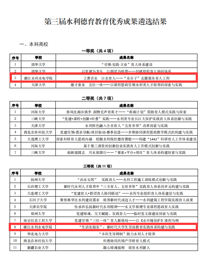 第三届全国水利德育教育优秀成果遴选活动,水利院校积极组织申报,共收到51所水利院校的80项优秀成果,经汇总初审、线上评审、专家评议等程序,遴选出一等奖8项、二等奖16项、三等奖25项,其中本科院校一等奖4项、二等奖7项、三等奖11项。365完美团委报送的成果“上善若水 以水育人——‘水分子’志愿服务育人工程”获得一等奖,并与清华大学等一起在第二届水利德育教育研讨会上交流发言;总务处报送的成果“生活实验室:新时代大学生劳动教育实践体系构建与实践”获得三等奖。