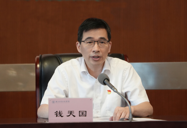 钱天国指出,今年4月以来,学校党委认真贯彻党中央和省委的统一部署,在省委主题教育第十五巡回指导组的悉心指导下,聚焦“学思想、强党性、重实践、建新功”总要求,对照主题教育具体目标,深入学习领悟习近平总书记关于以学铸魂、以学增智、以学正风、以学促干以及树立和践行正确政绩观等重要论述精神,扎实推进主题教育各项工作,取得了较好成效。一是加强组织领导,坚持高标准严要求。围绕理论学习、调查研究、推动发展、检视整改、建章立制等5项重点工作,制定主题教育“1+N”工作方案和“一表三清单”;实行领导小组定期研究、基层党组织定期汇报交流、主题办每周例会等制度;建立保障机制、推进机制、审核机制和督办机制,压实各级领导班子和领导干部责任。二是丰富形式载体,做到“四联五学”全覆盖。实行校党委、二级党组织、党支部、党员干部四级联动,综合运用自学、研学、溯源学、党课学、活态学等五种学习方式,通过党委理论学习中心组学习、读书班、“三会一课”、理论宣讲等多种途径,打造学习矩阵,推动习近平新时代中国特色社会主义思想入脑入心。三是贴近工作实际,在调研解题上下功夫。围绕立德树人根本任务,结合当前重点工作,高质量开展“大走访大调研大服务大解题”活动,学校领导班子和中层干部分别完成专题调研课题11项、30项,全校完成各类调研转化、即知即改项目82项。四是坚持问题导向,在检视整改上下功夫。建立问题“收集遴选—归口管理—动态销号”机制,共检视学校面上问题10个、二级党组织层面问题40个;以“专班化组织、清单式管理、销号式落实”稳步推进问题整改;回应师生“急难愁盼”,推进民生实事项目10个;践行新时代“浦江经验”,校院两级同向发力、共同答题;从校情校本出发,紧盯办学治校薄弱点,新制定15项制度,巩固深化检视整改成效。五是紧扣发展主线,积极建新功求实效。将主题教育与贯彻习近平总书记“贺信精神”贯通起来,进一步激发广大党员干部的干事创业热情,大家纷纷表示要坚定不移沿着总书记指引的“高质量、有特色”发展方向奋勇前进。通过开展主题教育,有力推动了党建“四个融合”,有效提升了党员干部推动学校事业发展的能力,加快解决了学校发展中的一些堵点难点问题,在人才引进、硕士点立项建设、现代产业学院建设、数字孪生流域科研创新、服务地方水利事业等方面取得了实质性进展和新的成效。主题教育期间,学校新增1个全省“双带头人”党支部书记工作室,1个全省高校党建标杆院系、2个样板党支部,7个水利先锋党支部;1个案例入选全省高校校企地党建联建典型案例,2个案例入选钱塘区政校企党建融合优秀案例,1个单位获评钱塘区政校企党建融合先进党组织。