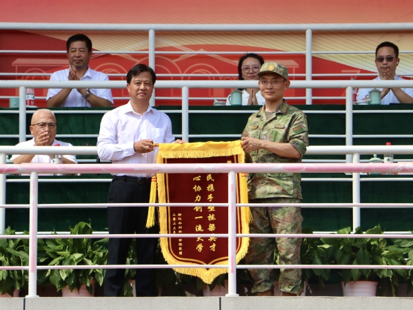 校长陈光亭代表学校向军训师师长储新松赠送锦旗。副校长姜翰照作军训工作总结。军训师副政委、学生处处长许栋宣读学生军训先进文件。军训师副政委、体军部主任李亚慰主持。军训师全体参训师生、承训教官、新生辅导员参加。