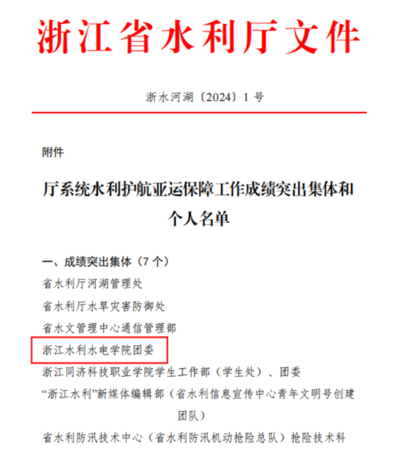 杭州亚运会、亚残运会期间,在省委、省政府坚强领导下,全省水利系统广大干部职工凝心聚力、众志成城,交出了水利护航亚运的优异答卷,为树立典型、推动工作,省水利厅决定对7个成绩突出集体和46名成绩突出个人予以通报表扬,校团委获“成绩突出集体”荣誉称号,机械与汽车工程学院吴文涛等11名老师获“成绩突出个人”荣誉称号。