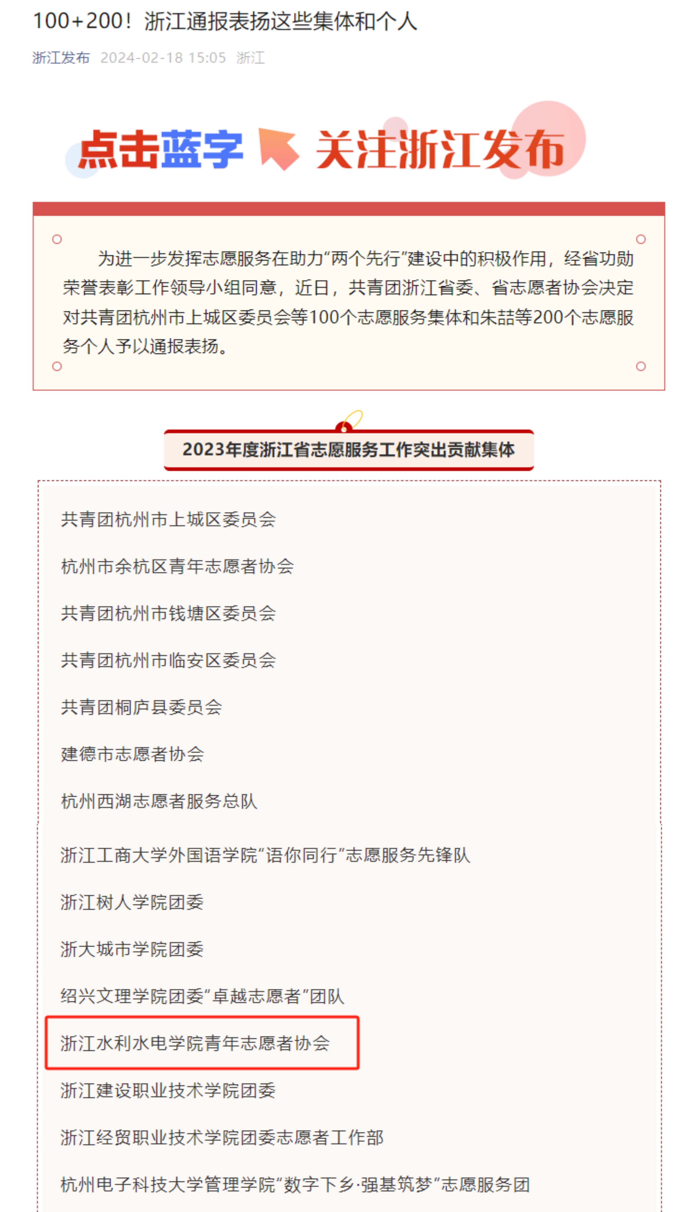 为持续放大“浙江有礼”省域文明新实践品牌效应,继续在推动志愿服务事业发展中发挥排头兵作用,省委宣传部、省文明办、省民政厅举办第四届浙江省志愿服务项目大赛,校团委、水利与环境工程学院团委联合申报的《校地合作 社团引领 共建社会服务工作站》项目获“优秀奖”。