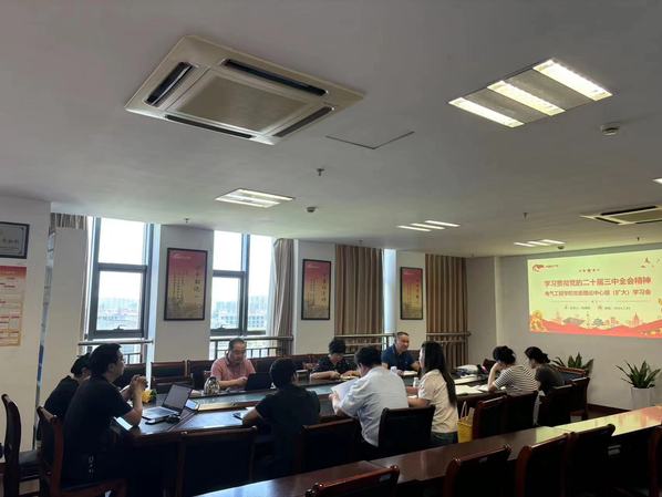 7月24日上午,电气学院在钱塘校区教学科研综合楼708会议室召开党委理论学习中心组扩大会,传达学习贯彻党的二十届三中全会精神,结合学校党委(扩大)会议要求,就本院今后一段时间如何深入学习宣传贯彻全会精神进行研究部署。会议由学院党委书记杨清刚主持,学院在校班子成员、师生党支部书记、教研室负责人等参加现场学习,部分人员线上参会学习。