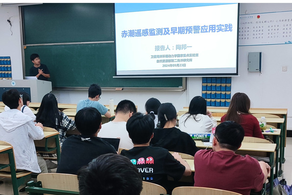 陶邦一从卫星遥感的优势和赤潮遥感的快速发展出发,详细讲述了极轨和静止水色卫星赤潮遥感自动化监测系统构建及在东海海域的业务化应用情况、基于空谱融合的国产高空间分辨率卫星在近岸赤潮定量化监测方法、藻类光谱特征在赤潮优势藻种识别和赤潮生命周期状态判别方面的新进展,以及目前卫星遥感与数值动力模型等大数据相结合在近海赤潮生消变化智能预警探索的重要意义。报告内容充实,丰富了同学们对遥感领域的认识,激发了同学们队专业知识得深入思考。讲座中,陶邦一与师生积极互动,一一解答了师生们提出的问题。