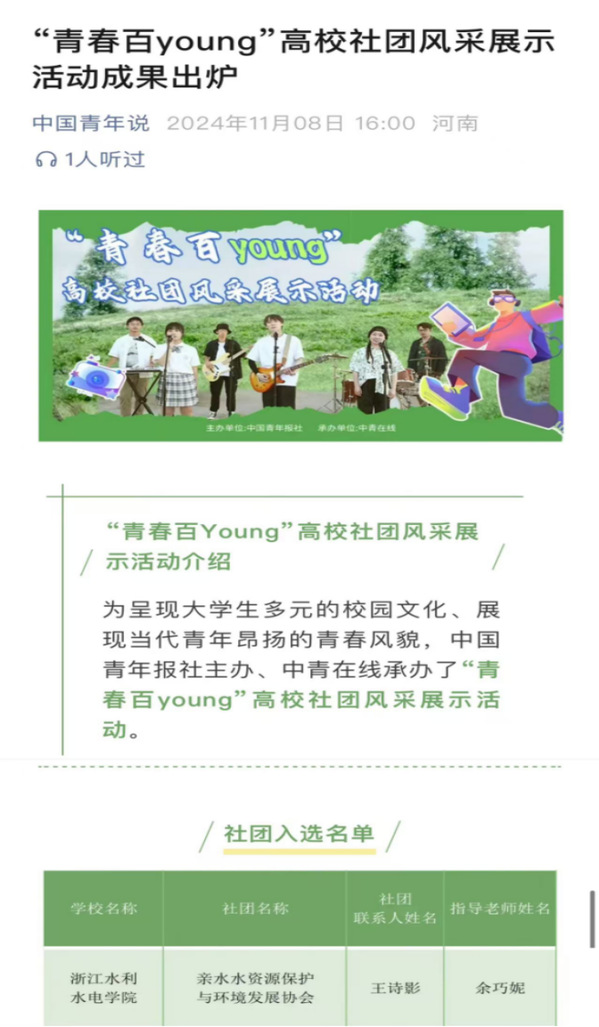 近日,在中国青年报社主办、中青在线承办的“青春百young”高校社团风采展示活动中,365完美亲水水资源保护与环境发展协会入选优秀社团。